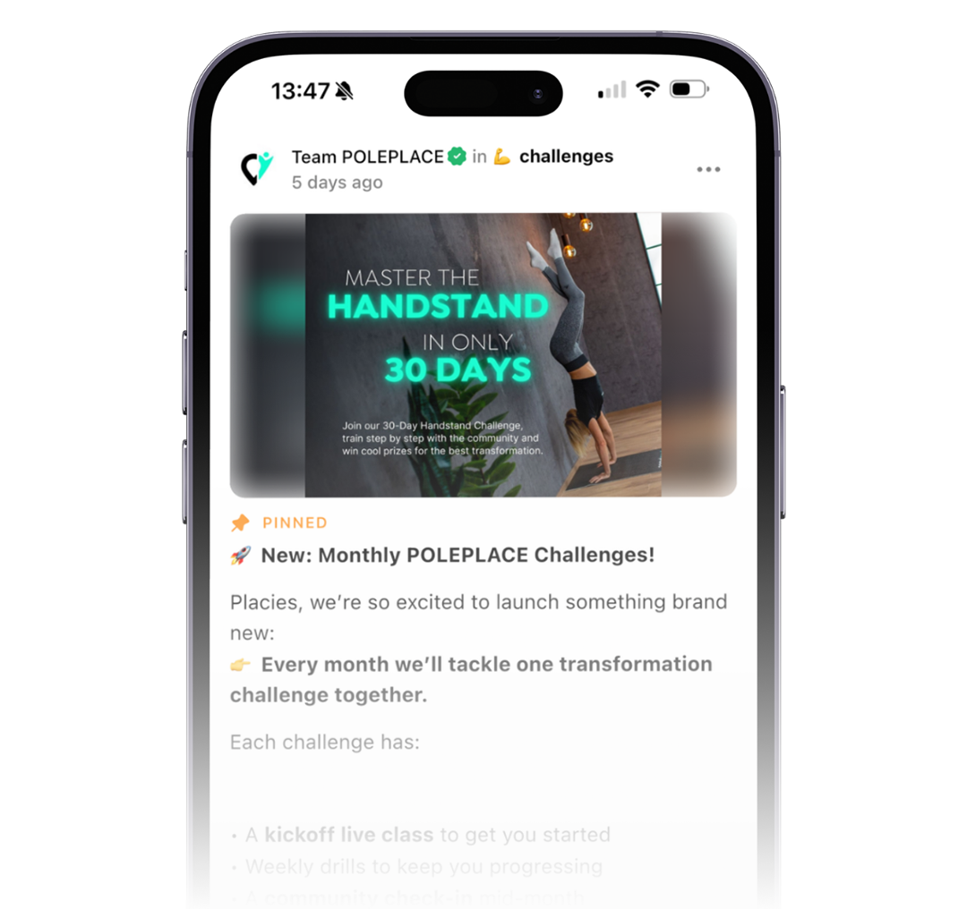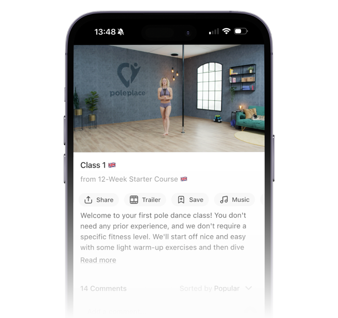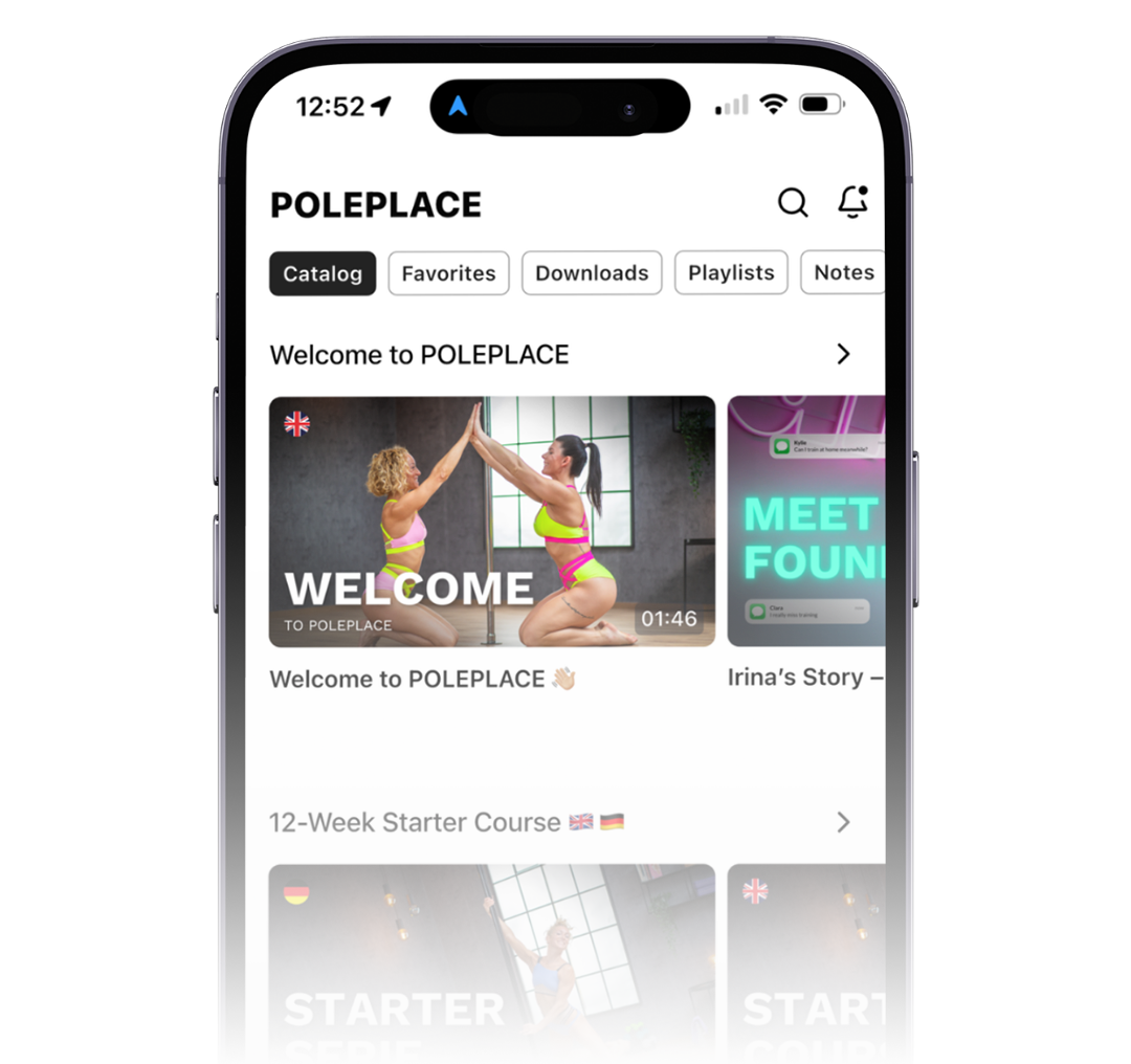 At POLEPLACE, we’ve created a safe space where beginners actually feel seen. No experience? No problem. Our structured 12-week course and empowering live classes are designed to help you feel strong, supported, and unstoppable and with our big library of +400 pole dance tutorials your pole journey knows no limits.